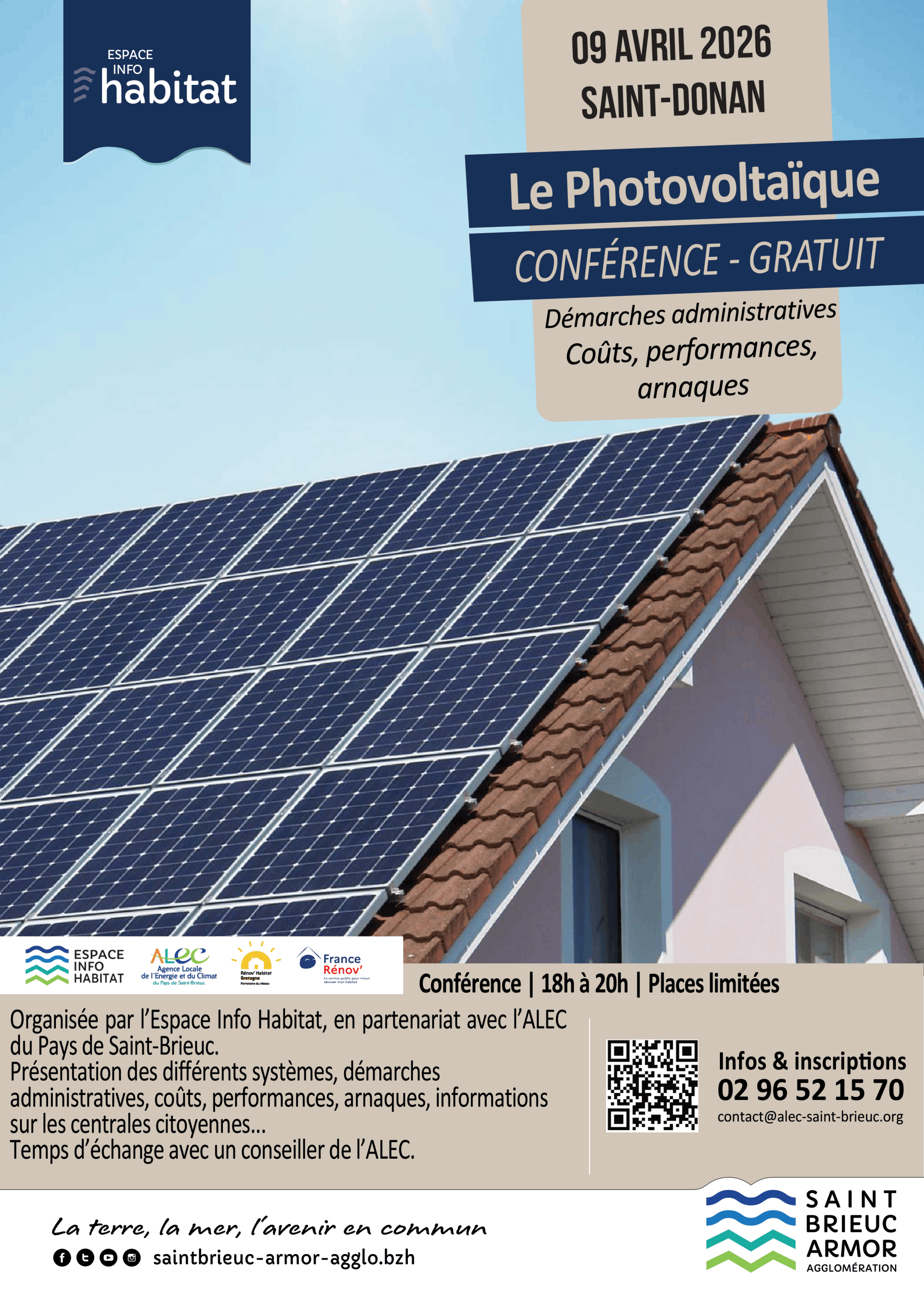 Saint-Brieuc Armor Agglomération, en partenariat avec l’Agence Locale de l'Énergie et du Climat (ALEC) du Pays de Saint-Brieuc, invite le grand public à une conférence gratuite sur le photovoltaïque, le jeudi 9 avril 2026 de 18h à 20h à Saint-Donan.