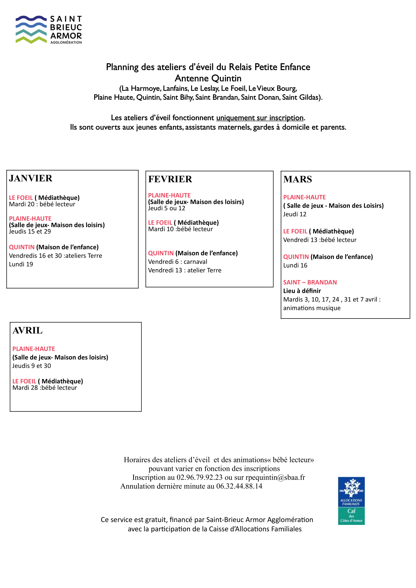 Ci-joint les dates d'ateliers d'éveil proposés par l'antenne Relais Petite Enfance de Quintin.Les ateliers se font uniquement sur inscription.